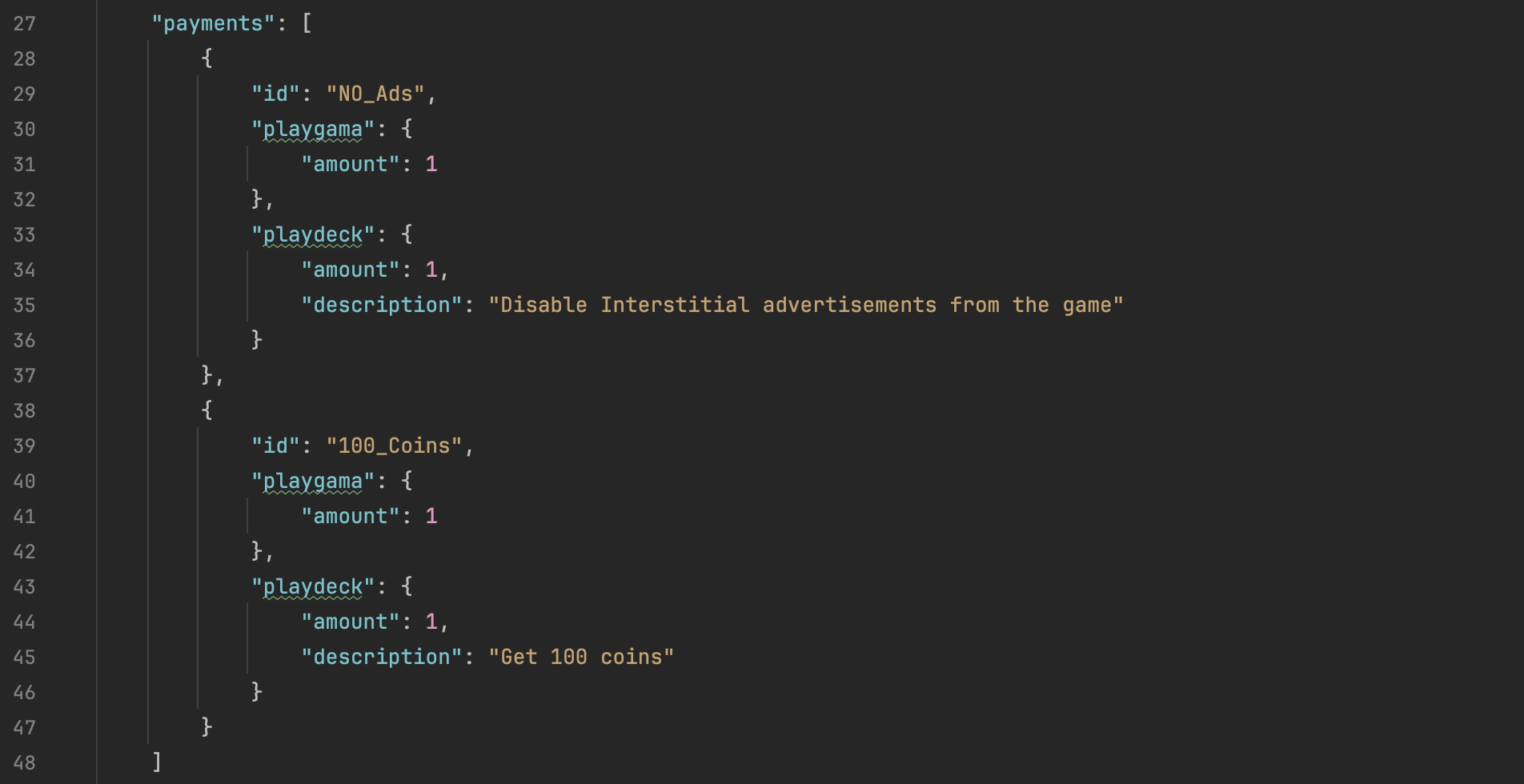 Add your IAP definitions to the `payments` array in the JSON file. Here’s an example based on our Demo project: