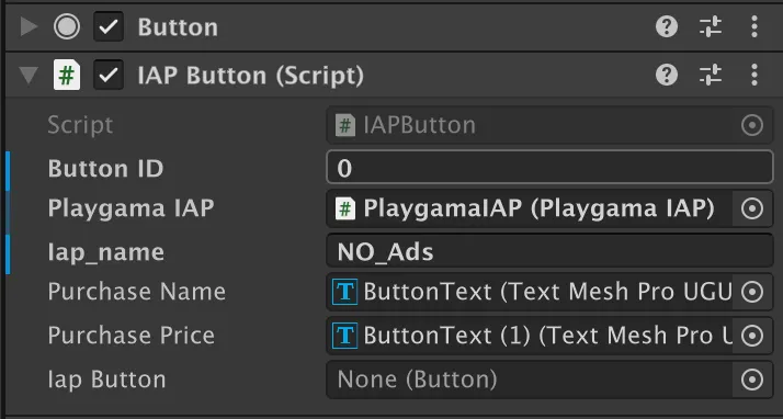 As shown in Step 4, your UI button will call the `InitiatePurchase` method located in your **PlaygamaIAP.cs** script. The `iapName` parameter passed to this method is the `id` you defined in your **playgama-bridge-config.json** file (e.g., "NO\_Ads", "100\_Coins"). &#x20;