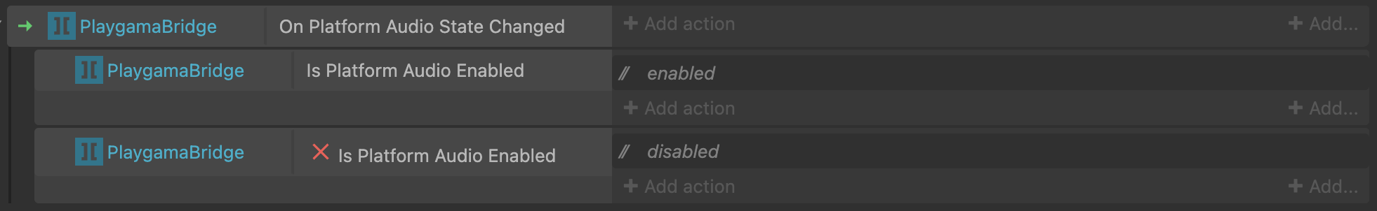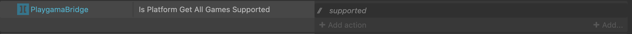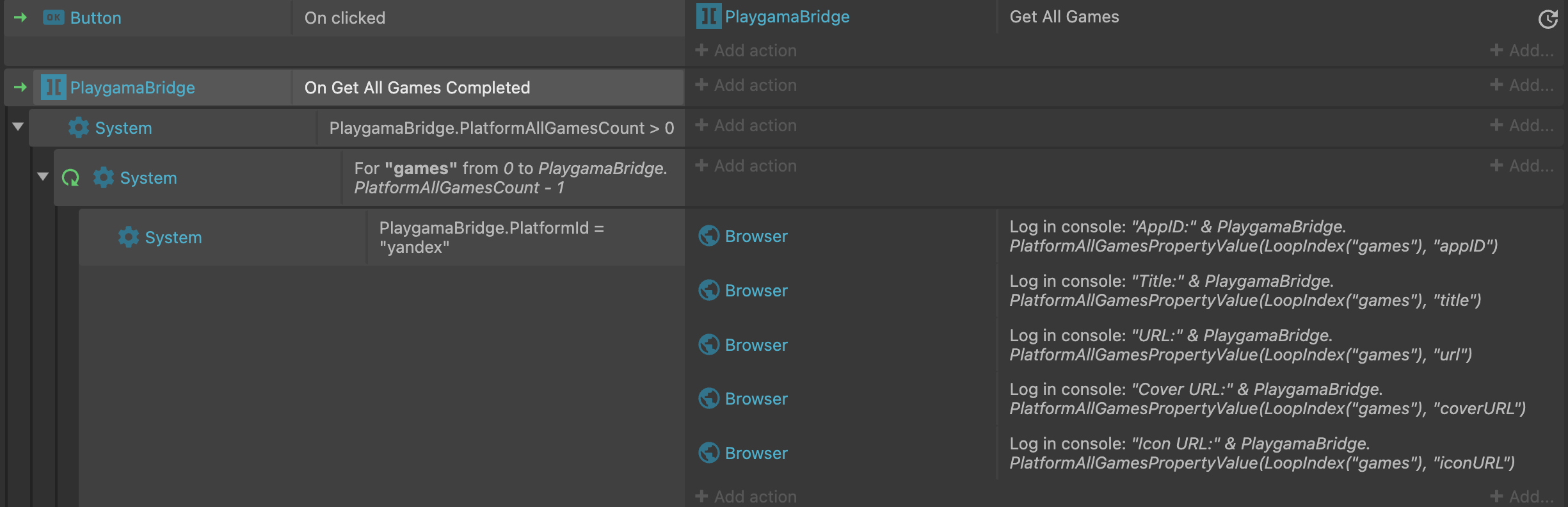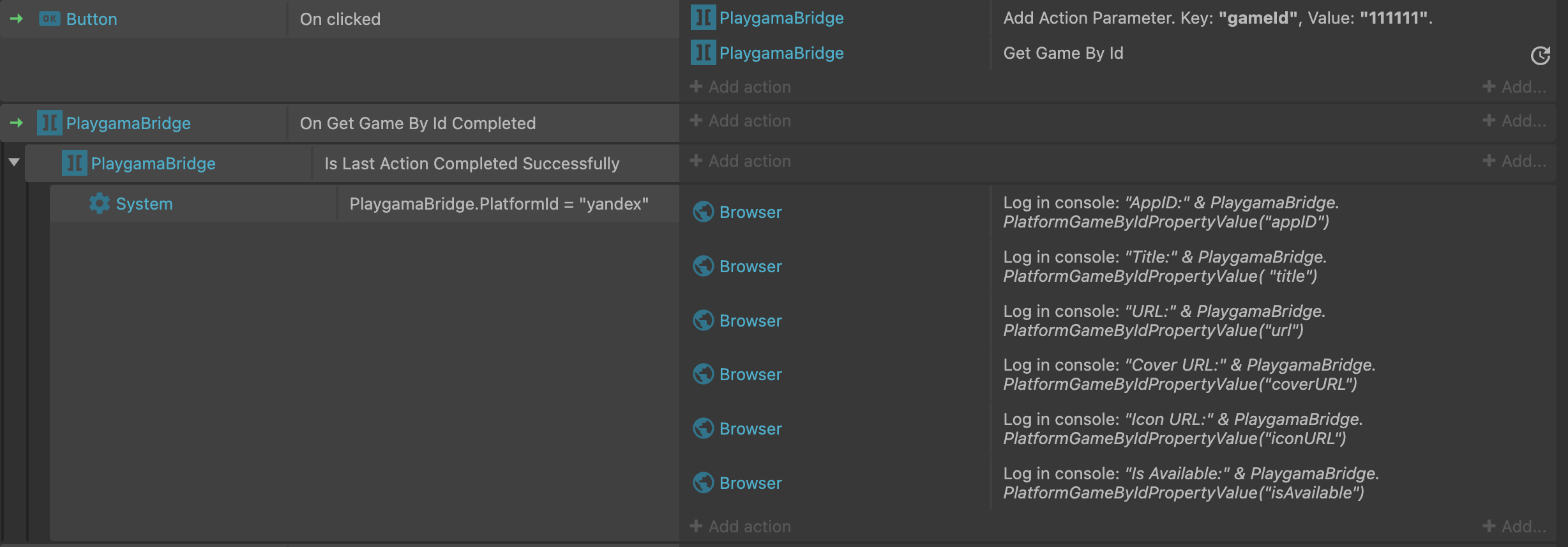 {"is-c3-clipboard-data":true,"type":"events","items":[{"eventType":"block","conditions":[{"id":"on-clicked","objectClass":"Button"}],"actions":[{"id":"add-action-parameter","objectClass":"PlaygamaBridge","parameters":{"key":"\"gameId\"","value":"\"111111\""}},{"id":"get-game-by-id","objectClass":"PlaygamaBridge"}]},{"eventType":"block","conditions":[{"id":"on-get-game-by-id-completed","objectClass":"PlaygamaBridge"}],"actions":[],"children":[{"eventType":"block","conditions":[{"id":"is-last-action-completed-successfully","objectClass":"PlaygamaBridge"}],"actions":[],"children":[{"eventType":"block","conditions":[{"id":"compare-two-values","objectClass":"System","parameters":{"first-value":"PlaygamaBridge.PlatformId","comparison":0,"second-value":"\"yandex\""}}],"actions":[{"id":"log","objectClass":"Browser","parameters":{"type":"log","message":"\"AppID:\" & PlaygamaBridge.PlatformGameByIdPropertyValue(\"appID\")"}},{"id":"log","objectClass":"Browser","parameters":{"type":"log","message":"\"Title:\" & PlaygamaBridge.PlatformGameByIdPropertyValue( \"title\")"}},{"id":"log","objectClass":"Browser","parameters":{"type":"log","message":"\"URL:\" & PlaygamaBridge.PlatformGameByIdPropertyValue(\"url\")"}},{"id":"log","objectClass":"Browser","parameters":{"type":"log","message":"\"Cover URL:\" & PlaygamaBridge.PlatformGameByIdPropertyValue(\"coverURL\")"}},{"id":"log","objectClass":"Browser","parameters":{"type":"log","message":"\"Icon URL:\" & PlaygamaBridge.PlatformGameByIdPropertyValue(\"iconURL\")"}},{"id":"log","objectClass":"Browser","parameters":{"type":"log","message":"\"Is Available:\" & PlaygamaBridge.PlatformGameByIdPropertyValue(\"isAvailable\")"}}]}]}]}]}