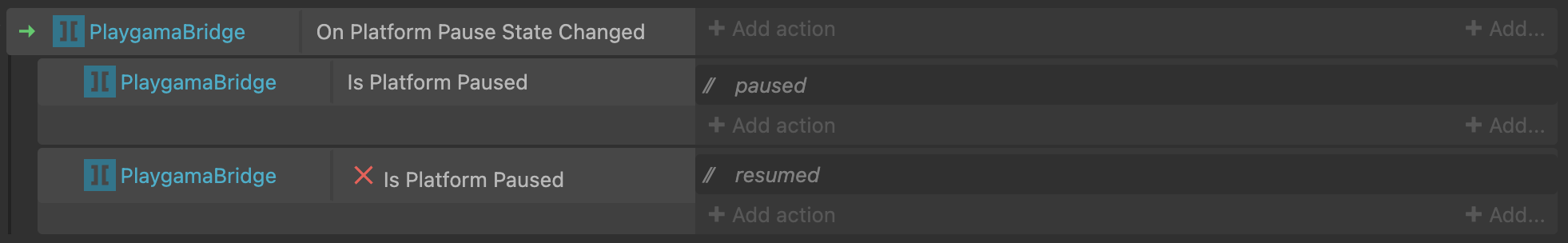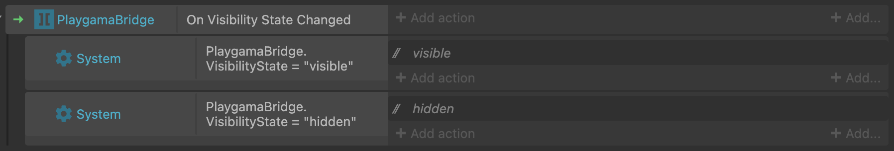 {"is-c3-clipboard-data":true,"type":"events","items":[{"eventType":"block","conditions":[{"id":"on-visibility-state-changed","objectClass":"PlaygamaBridge"}],"actions":[],"children":[{"eventType":"block","conditions":[{"id":"compare-two-values","objectClass":"System","parameters":{"first-value":"PlaygamaBridge.VisibilityState","comparison":0,"second-value":"\"visible\""}}],"actions":[{"type":"comment","text":"visible"}]},{"eventType":"block","conditions":[{"id":"compare-two-values","objectClass":"System","parameters":{"first-value":"PlaygamaBridge.VisibilityState","comparison":0,"second-value":"\"hidden\""}}],"actions":[{"type":"comment","text":"hidden"}]}]}]}