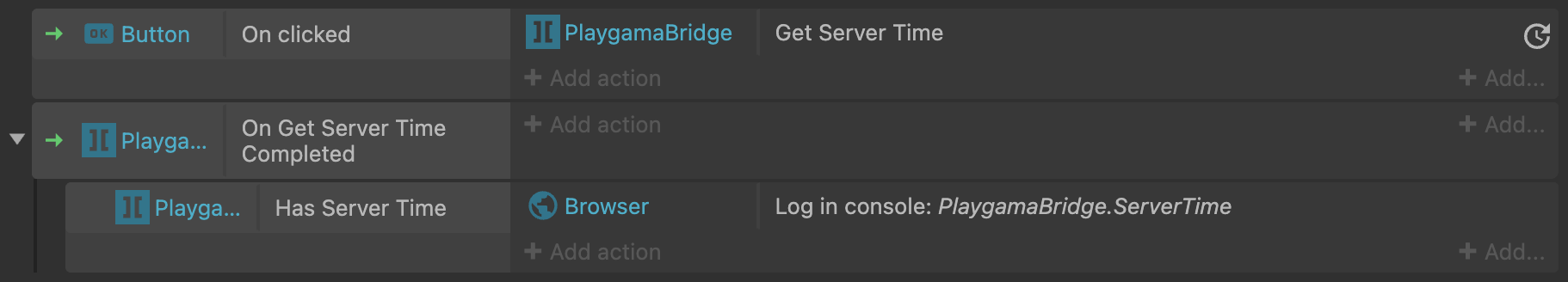 {"is-c3-clipboard-data":true,"type":"events","items":[{"eventType":"block","conditions":[{"id":"on-clicked","objectClass":"Button"}],"actions":[{"id":"get-server-time","objectClass":"PlaygamaBridge"}]},{"eventType":"block","conditions":[{"id":"on-get-server-time-completed","objectClass":"PlaygamaBridge"}],"actions":[],"children":[{"eventType":"block","conditions":[{"id":"has-server-time","objectClass":"PlaygamaBridge"}],"actions":[{"id":"log","objectClass":"Browser","parameters":{"type":"log","message":"PlaygamaBridge.ServerTime"}}]}]}]}
