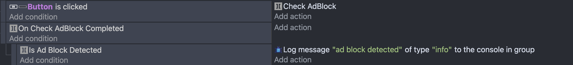 {"000kind":"GDEVELOP_EventsAndInstructions_CLIPBOARD_KIND-jsBdHbLy912y8Rc","content":{"eventsList":[{"type":"BuiltinCommonInstructions::Standard","conditions":[{"type":{"value":"PanelSpriteButton::PanelSpriteButton::IsClicked"},"parameters":["Button",""]}],"actions":[{"type":{"value":"PlaygamaBridge::CheckAdBlock"},"parameters":["",""]}]},{"type":"BuiltinCommonInstructions::Standard","conditions":[{"type":{"value":"PlaygamaBridge::OnCheckAdBlockCompleted"},"parameters":["",""]}],"actions":[],"events":[{"type":"BuiltinCommonInstructions::Standard","conditions":[{"type":{"value":"PlaygamaBridge::IsAdBlockDetected"},"parameters":["",""]}],"actions":[{"type":{"value":"DebuggerTools::ConsoleLog"},"parameters":["\"ad block detected\"","\"info\"",""]}]}]}],"eventsCount":2,"actionsList":[],"actionsCount":0,"conditionsList":[],"conditionsCount":0}}